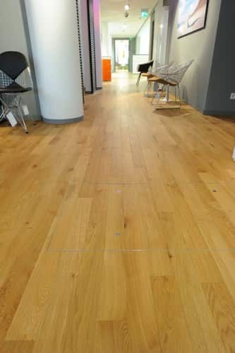 Hochwertiges, gebürstetes Massivparkett (Eiche) mit matter Versiegelung – extrem strapazierfähig, pflegeleicht und mit intensiver Holzstruktur. Schubfest geklebt verlegt auf Hohlraumboden/Doppelboden. Perfekt für Büro, Loft und moderne Wohnräume: edle Optik, beste Akustik und jederzeit zugängliche Installationen. Langlebig, natürlich, flexibel.