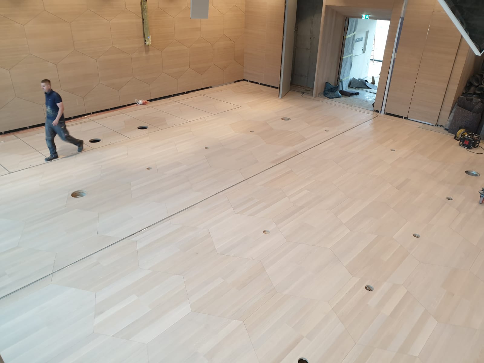 Hochwertiges, gebürstetes Massivparkett (Eiche) mit matter Versiegelung – extrem strapazierfähig, pflegeleicht und mit intensiver Holzstruktur. Schubfest geklebt verlegt auf Hohlraumboden/Doppelboden. Perfekt für Büro, Loft und moderne Wohnräume: edle Optik, beste Akustik und jederzeit zugängliche Installationen. Langlebig, natürlich, flexibel.